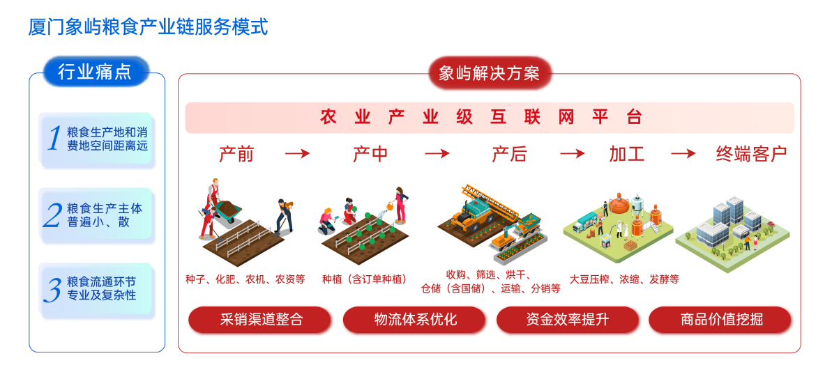 邓启东在致辞中表示,挑战面前,粮食物贸市场正在呼唤新的流通途径、新的物流模式,从而开启粮食产业链供应链高质量发展的新篇章。象屿作为一家大宗商品供应链服务企业,正在全力打造粮食物贸全产业链,重点围绕粮食物流网络化、金融服务规模化、风险管理严格化不断创新突破。