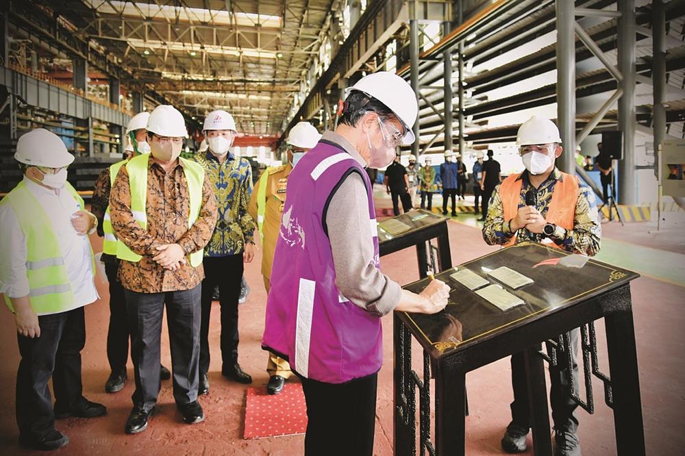 ▲印尼总统佐科视察象屿印尼项目并在镶有公司产品的石牌上签字留念