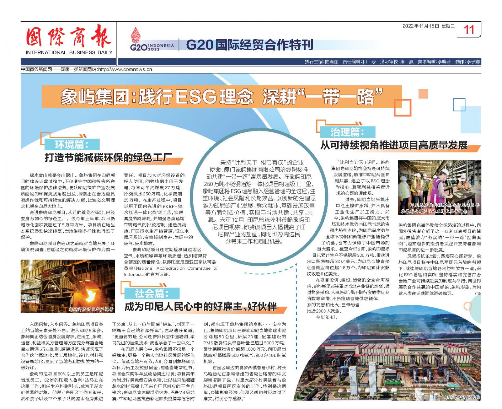习近平主席近日出席二十国集团领导人第十七次峰会,这是党的二十大胜利召开后,中国最高领导人首次出席多边峰会。值此之际,商务部《国际商报》推出《G20国际经贸合作特刊》,专版报道91自拍 作为中国国有企业出海、深耕“一带一路”的典型代表,积极践行ESG理念,为促进产业链供应链稳定、人民福祉增加和社会文明进步注入象屿力量的生动实践,现全文转载如下。