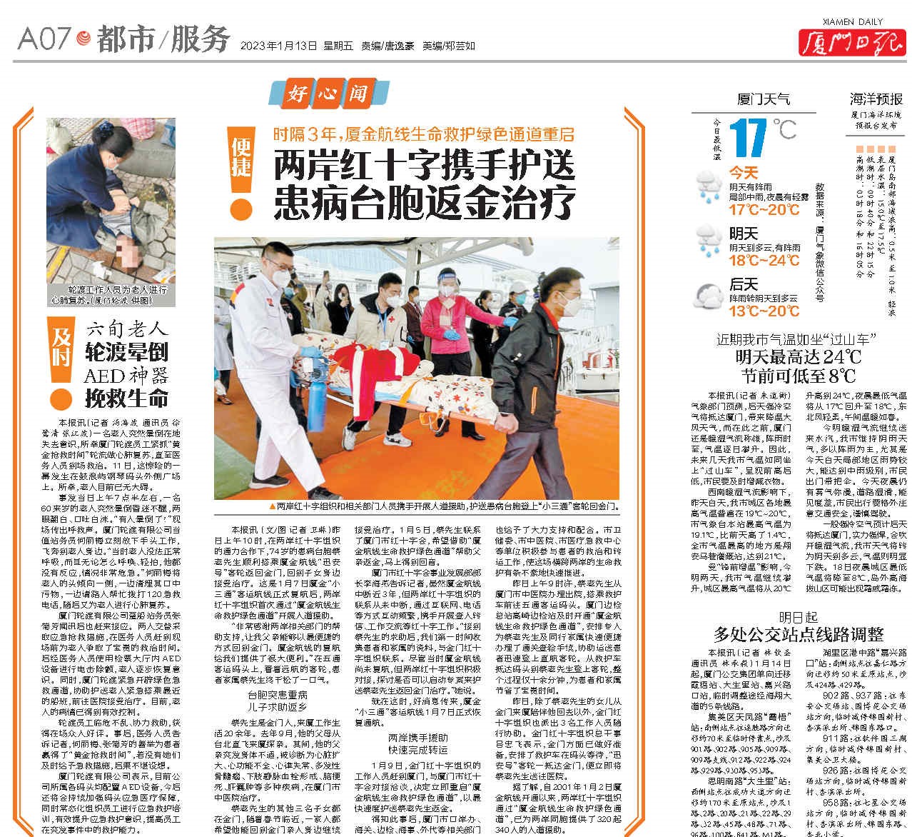 六旬老人突然晕迷,无法正常呼吸。厦门轮渡公司员工飞奔而来,为他清理口中污物并进行心肺复苏,赢得宝贵时间。医务人员到场后,检票大厅内常设的AED设备又成救命“神器”,终于让老人转危为安。1月13日出版的《厦门日报》报道了这惊险又感人的一幕。这也是8天内厦门轮渡公司员工挽救的第二条生命。