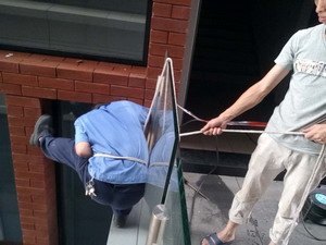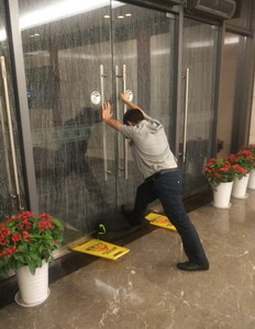 王志富是台风登陆当晚象屿高尚物业公司留下值守的54位员工中的一个,他负责国际航运中心D栋的安全。D栋处于风口位置。凌晨2点多,风大作,雨加急,那声势犹如排山倒海,让这位魁梧的大汉也是心惊。眼看防汛沙袋做的大门加固也无法阻挡风雨的侵入,他不顾只身一人,奋力顶住玻璃大门。“一旦雨水灌入大堂,流入电梯井,后果不堪设想!”闻讯赶来增援的4位值守人员也都扑上来用力顶住大门,五人使足了劲,一个多小时后,风力减弱,他们以坚定的意志战胜了狂暴的台风,玻璃门没有倒下,D栋安全了!