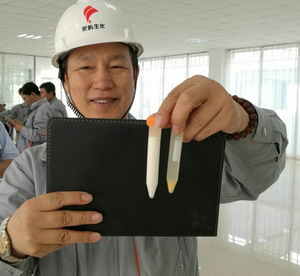 中午11时40分,淀粉车间传来喜讯,玉米成功通过浸泡、破碎、分离、洗涤、脱水、干燥等工序后成功产出淀粉及副产品。象屿生化生产总监林继民介绍,短短四小时便能一次性试车成功,这在淀粉行业史无前例,象屿生化再创佳绩!