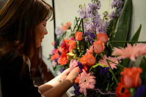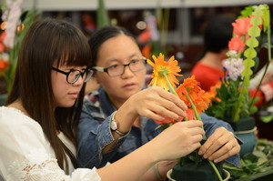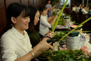 参加培训的女职工们用自己的插花作品祝福集团21岁生日快乐