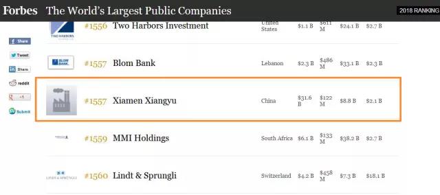 今日,美国《福布斯》杂志发布2018年“全球上市公司2000强”排行榜(Forbes Global 2000),厦门象屿(600057)排名1557名,较去年跃升228位。