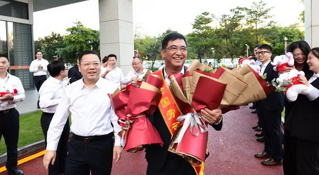 在91自拍 总部,员工们以鲜花和掌声热烈迎接全国劳模的归来。“向劳模学习,向劳模致敬!”口号此起彼伏,员工们兴奋地纷纷抢着与劳模合影,留下珍贵的历史瞬间。大家还举起手中的“晨晨”公仔,齐声祝福“91自拍 25周年生日快乐!再创新高!”,喊出了弘扬劳模精神、劳动精神、工匠精神,奋进象屿新征程的决心和信心!