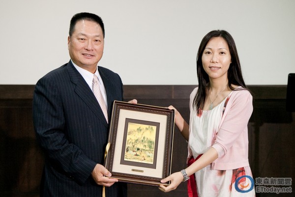 东森总裁王令麟(左)致赠郎世宁画作「八峻图」给来访的厦门市商务局副局长郑耀。(图/ETtoday)
