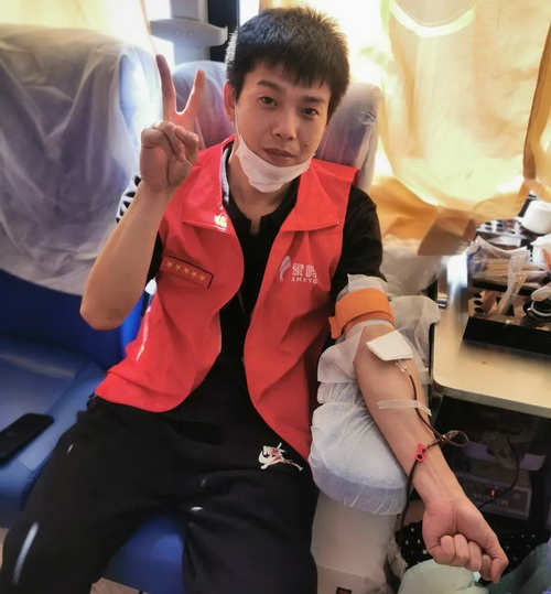 象屿志愿者在服务献血活动的同时,积极参与无偿献血。
