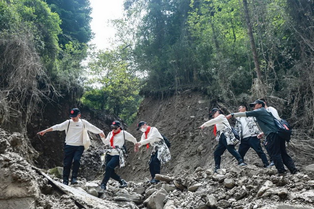 陈方总裁与邓启东总经理当先锋打头阵,带领先遣队徒步穿越红军小道,克服蚂蟥沟的心理障碍和高海拔的缺氧不适,跨越1100米的垂直高度,亲身体验攀峻岭、过草地的长征历程,感受共产党人革命理想高于天的坚定力量,彰显国有企业紧跟国家战略先行先试的先锋精神。
