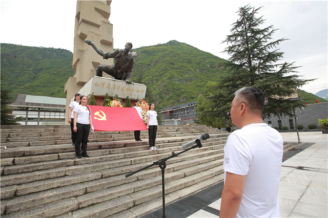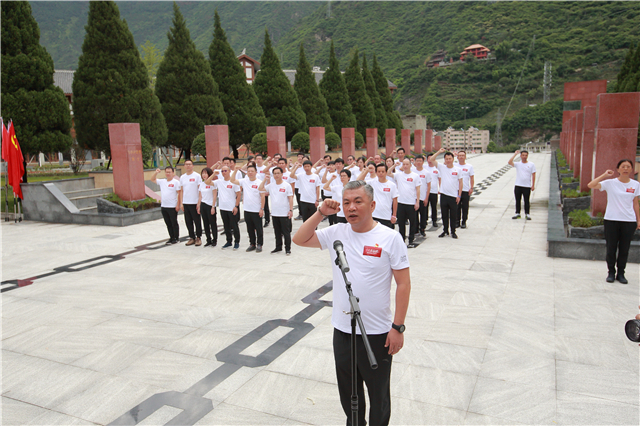 重温入党誓词,牢记入党初心。在红军飞夺泸定桥纪念碑前,在鲜红的党旗下,刘志宏书记带领全体党员举起右拳,神情庄重、精神饱满,齐声重温入党誓词,感受涌动的初心,激发前行的动力。铿锵有力的宣誓声响彻现场,宣示着“挑战之旅”广大党员坚定不移的政治信念和矢志奋斗的坚强决心。