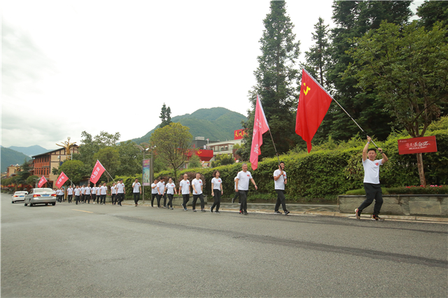 在磨西镇的徒步活动中,挑战之旅队伍不畏天气多变、道路崎岖,精神抖擞地重走红军曾经走过的磨西老街,参观了中央红军总政治部旧址、毛泽东同志住地旧址等红色遗迹,深刻感悟红军面对挑战时的革命乐观主义精神。