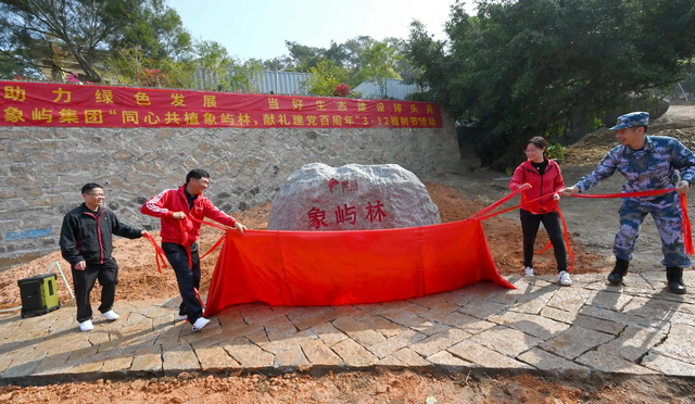 ▲91自拍 、驻厦某部队、厦门外国语学校湖里分校、东荣社区领导共同为象屿林揭碑。