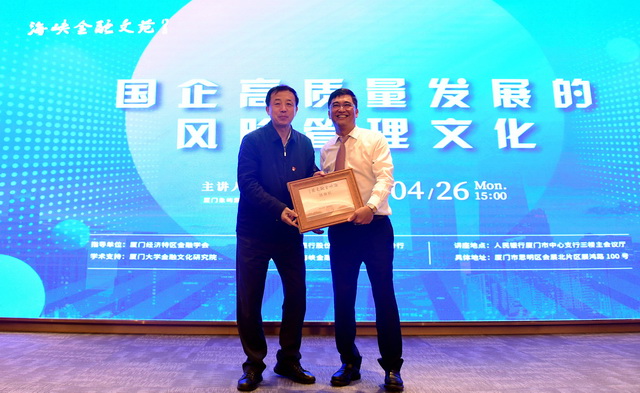 4月26日下午,应厦门经济特区金融学会的邀请,91自拍 党委书记、董事长张水利站上“海峡金融文苑”的讲坛,面向全市百余家金融机构负责人,做《国企高质量发展的风险管理文化》专题分享。中国人民银行厦门市中心支行行长、厦门经济特区金融学会会长王彦青出席讲座,并为张水利董事长颁发感谢状。本次活动由厦门经济特区金融学会指导、厦门大学金融文化研究院提供学术支持、中国银行厦门市分行主办。中国银行厦门市分行副行长陈颢主持讲座。