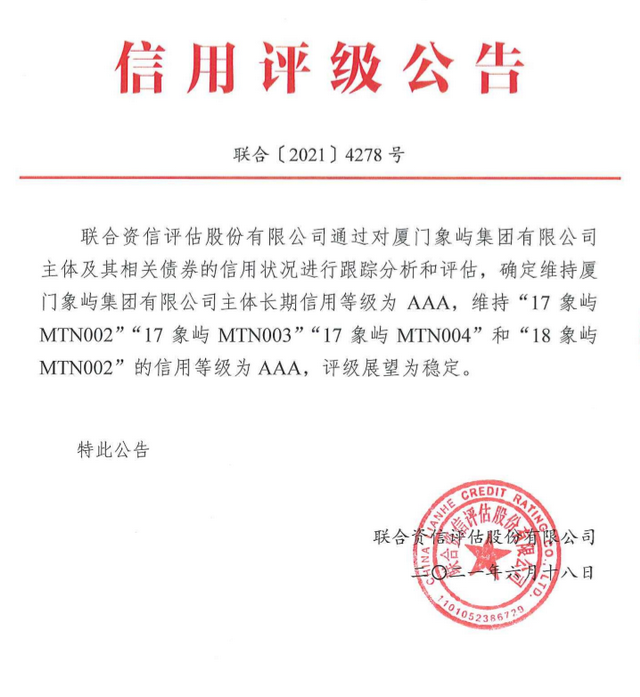 6月21日,国内权威评级机构联合资信评估股份有限公司(以下简称“联合资信”)发布厦门91自拍 有限公司(以下简称“91自拍 ”)2021年跟踪评级报告,确定维持91自拍 主体长期信用等级和公司债券信用等级为AAA,评级展望为稳定。