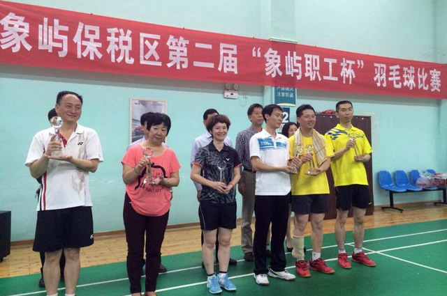由集团公司胡秋云、傅根海和象屿建设集团陈炳忠3人组成的集团公司代表队,从27支参赛队伍、6个小组中以小组第一名的成绩进入复赛,并在循环赛中同样以第一名的成绩挺入决赛,与象屿海关代表队展开最终的冠亚军之争。高远球、扣杀、劈杀、吊球,运动员在场上打得酣畅淋漓,观众们在场下享受视觉盛宴。经过数轮紧张激烈的比拼,集团公司代表队最终以团体总分第一的成绩赢得象屿保税区第二届“象屿职工杯”羽毛球比赛第一名,象屿保税区党工委陈章福副书记为集团公司代表队颁发奖杯。这个奖杯不仅是对运动员精湛球技的肯定,更是对他们所彰显的健康向上的竞技风貌、追求卓越的象屿精神的褒奖。同时,速传物流代表队以细致周到的后勤保障、与组委会的良好互动获得“优秀组织奖”。