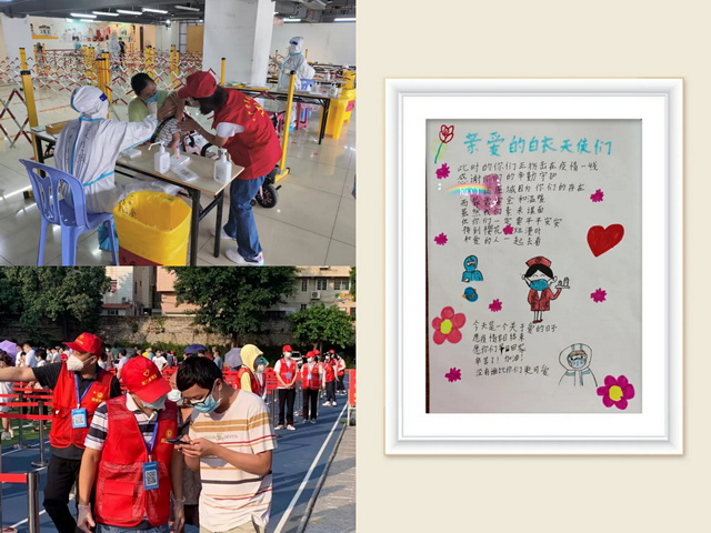来自象屿速传党办的禇颖与她爱人齐上阵,两人错开时间进行志愿服务,一人在外帮助市民进行核酸检测,一人在家照顾孩子,既顾好“小家”也顾着“大家”。