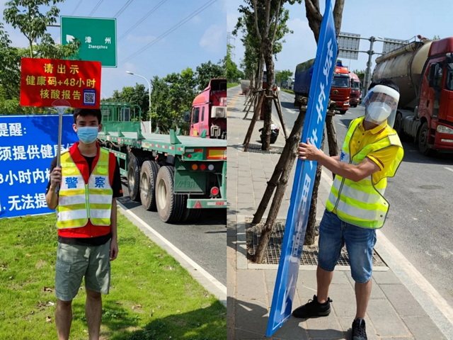 9月17日中午1点25分,共产党员、象屿建设集团防疫志愿者服务队队长郭振华接到海沧区疫情防控指挥部的通知,要求在下午三点前到达位于海沧海翔大道东埔村的检查站点,参与交通防控协管工作。