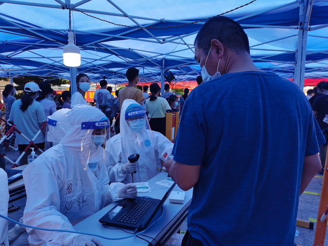 象屿地产党员志愿者王任卿,则在自己的防护服正面,写上了“厦门必胜”四个大字,将信心传递给每一位来检测的市民。他说:“防护服隔离了病毒却锁住了汗水,手被汗水泡皱,衣服沾在身上动弹不得。虽然闷热、笨重,心中却是满满的自豪感。战疫有我,厦门必胜!”