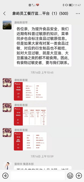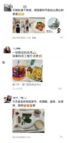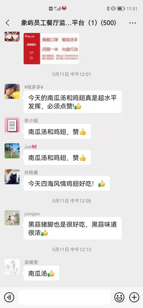 它更美在有家的感觉。每逢节日,餐厅用精心准备的美食,送上满满的祝福。妇女节女神披萨、母亲节养生汤、端午肉粽、中秋月饼……舌尖上的幸福,饱含着家的温暖。餐厅还先后建立4个交流微信群,参与员工近2000人。象屿家人们的每一项意见、建议,餐厅都会迅速答复,并每周公示员工反馈问题的解决进展。在交流群里、在朋友圈里,员工的点赞之声不绝于耳,餐厅平均满意度保持在90%以上。