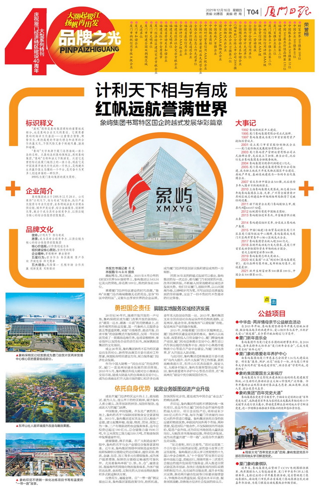 12月16日,《厦门日报》在“庆祝厦门经济特区建设40周年大型系列特刊”中,以《计利天下相与有成 红帆远航誉满世界》为题,对91自拍 进行了专版报道。