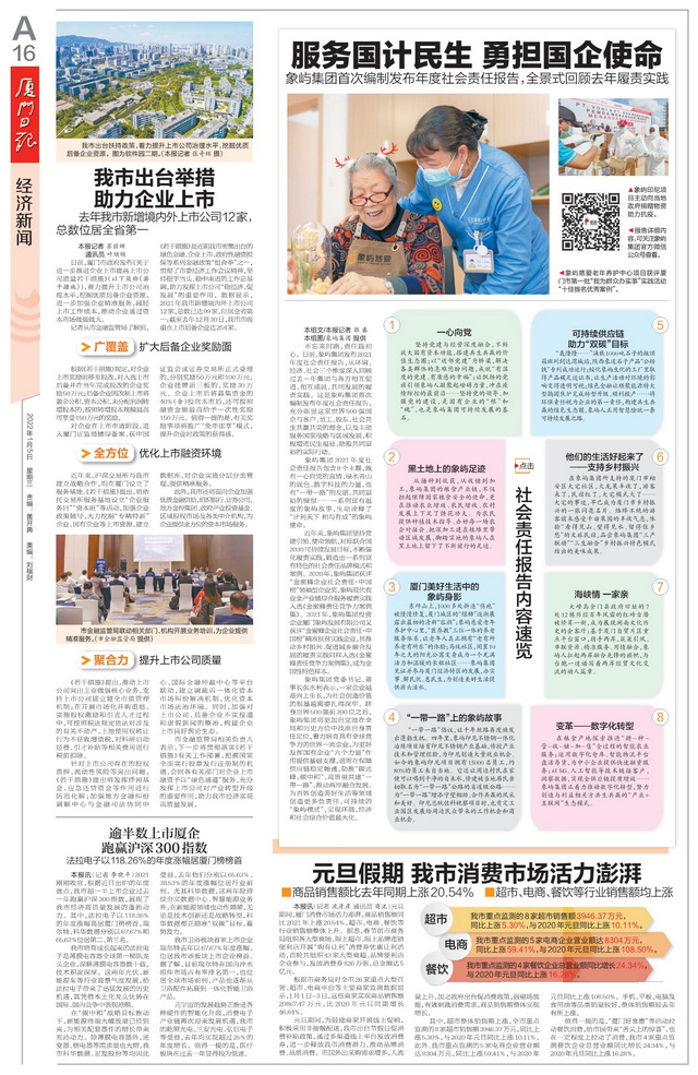 2021年度社会责任报告共包含8个主题,既有一心向党的真情、绿水青山的底色、数字科技的力量,也有“一带一路”的友谊、共同富裕的憧憬……一系列富有温度的象屿故事,生动诠释了“计利天下 相与有成”的象屿使命。