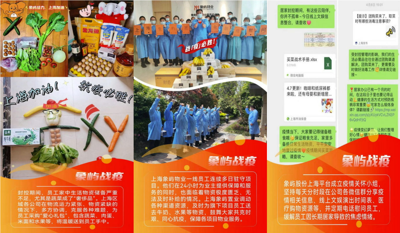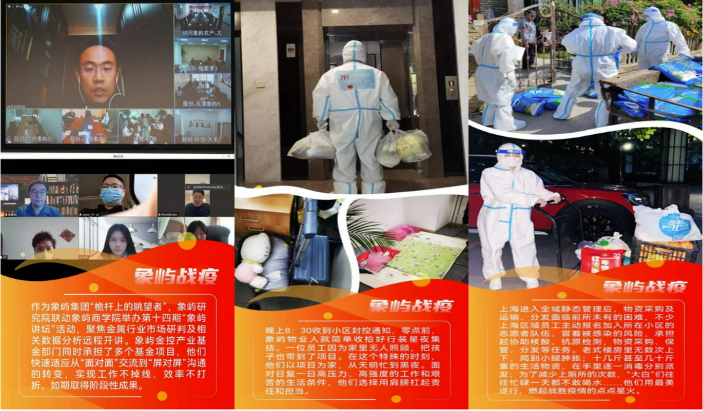 党委、集团公司、集团工会特向在沪员工发去暖心慰问信,并提供24小时不间断的员工心理关爱热线,帮助员工疏解情绪压力。集团党委、集团工会还相继出台多项防疫专项补助政策,并统筹协调旗下象屿股份、象屿地产、象屿金控等相关行业落实在沪员工关爱各项措施,为员工构筑坚实后盾。