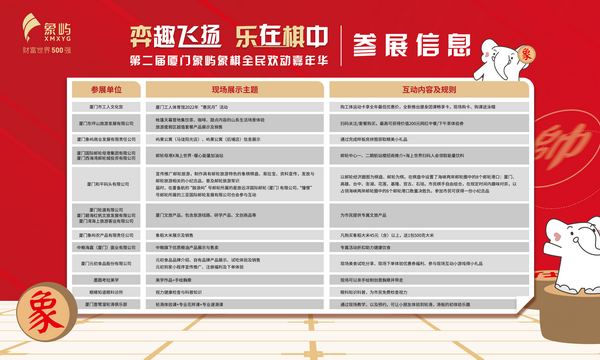 嘉年华现场还设置了象棋主题文化展区,包括当代象棋大师脸谱及象棋文化展、厦门象屿象棋队精彩回顾及象屿品牌、公益主题展等,通过丰富的图文资料,带您回顾厦门象屿象棋队的精彩瞬间,展示出征象甲“新班底”。