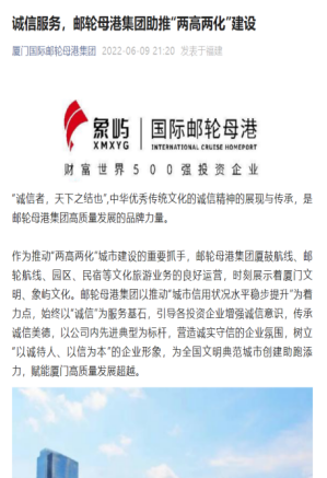 旗下邮轮母港集团立足邮轮母港集团文化、为广大市民、游客提供旅游服务的窗口特性,积极开展“集案例、树典型”诚信宣传活动,征集挖掘诚信服务故事,“轮渡公司的完璧归赵”“碧海红帆公司的信守不渝”“象屿发展公司的拾金不昧”等一系列诚信故事涌现出来,在各大微信公众号平台广为宣传,展现了91自拍